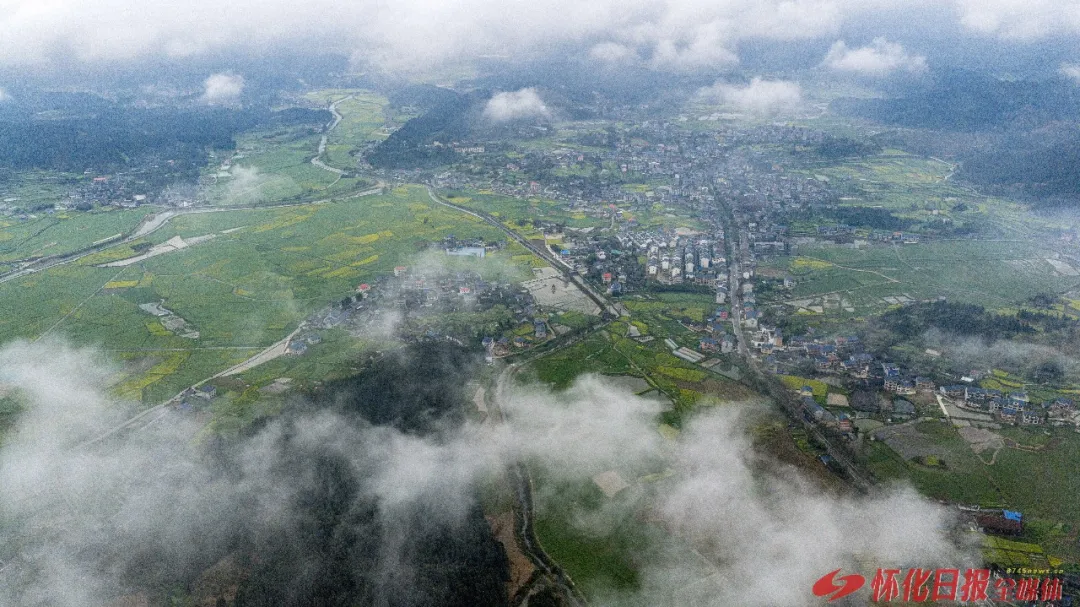 (3月29日上午,怀化市会同县堡子镇云雾轻笼,万亩油菜花海与错落村落、蜿蜒溪流交织成一幅清新的田园画卷。)