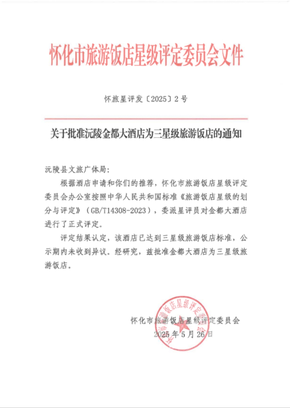 关于批准沅陵金都大酒店为三星级旅游饭店的通知