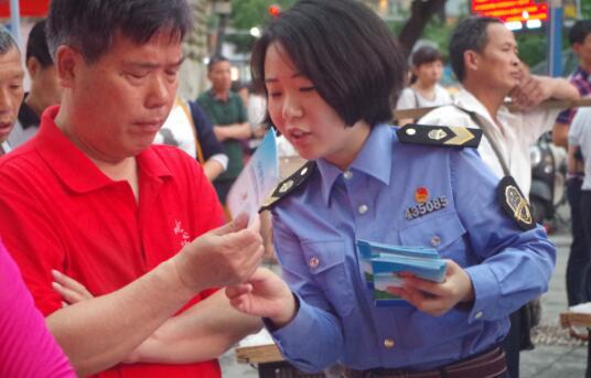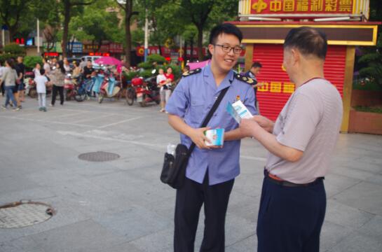 2017年6月17日18时,市委佳惠前,市食品药品监督管理局团员向观众发放保健食品安全宣传手册