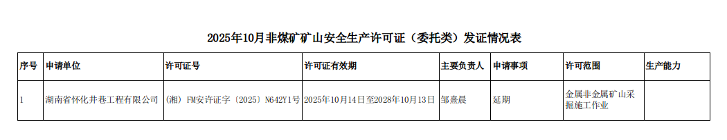 2025年10月非煤矿矿山安全生产许可证(委托类)发证情况表