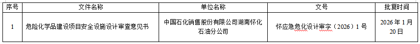 2026年1月危险化学品建设项目安全设施设计审查批复公示