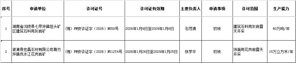 2026年1月非煤矿矿山安全生产许可证(委托类)发证情况表