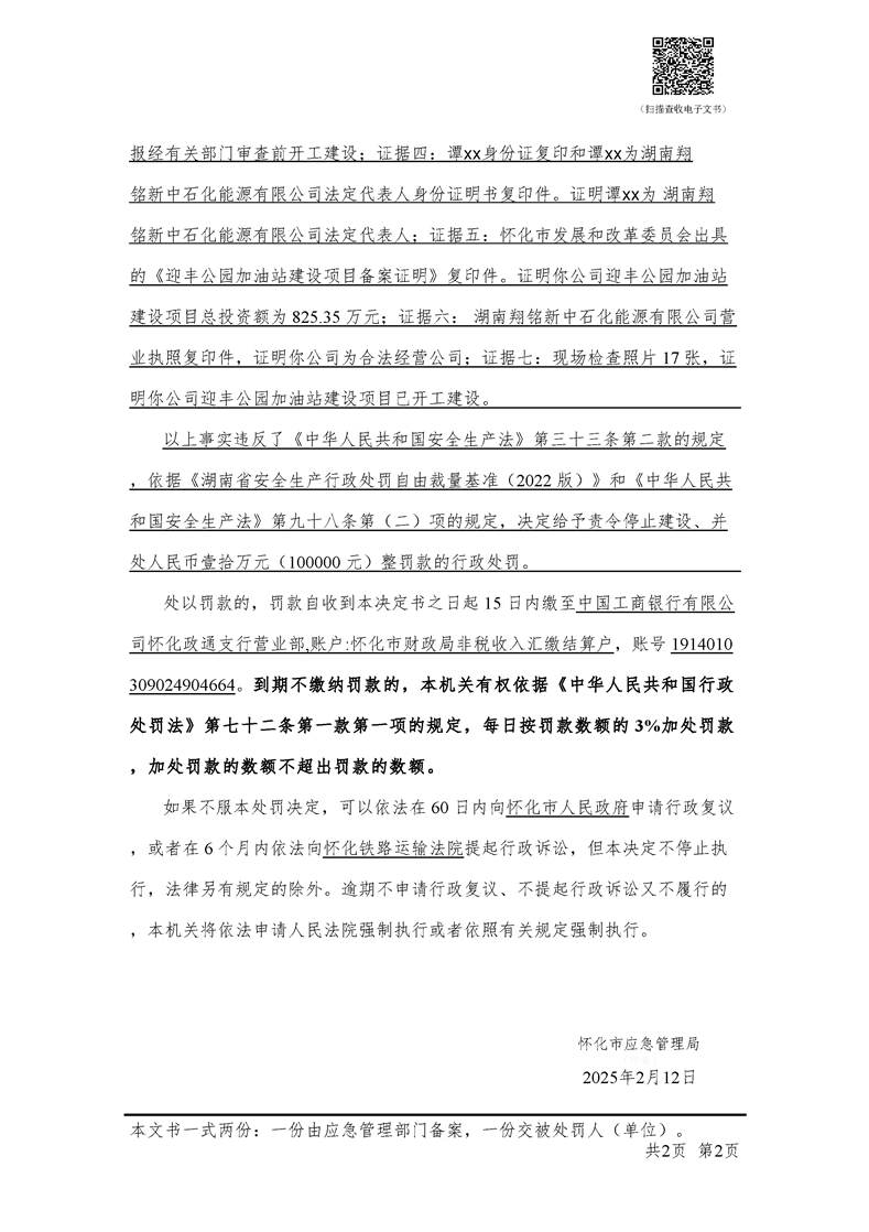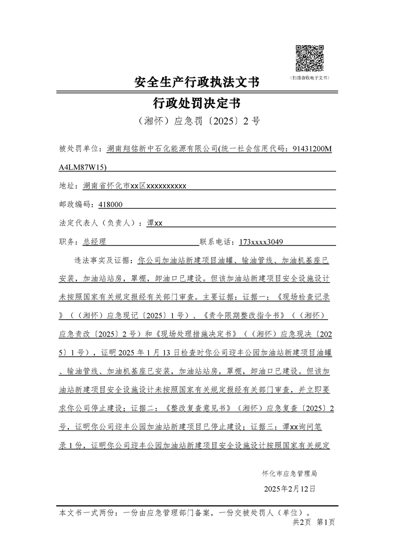 行政处罚决定书(湘怀)应急罚〔2025〕2 号