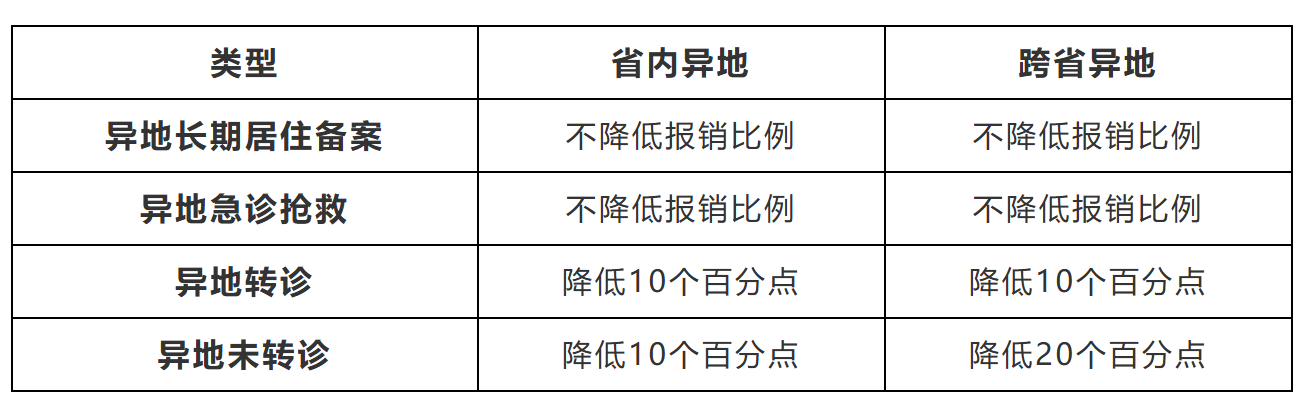 统一异地就医政策,异地长期居住备案和异地急诊抢救人员报销支付比例执行参保地标准,省内异地就医和跨省异地转诊报销支付比例下降10个百分点,非急诊且未转诊的跨省异地就医报销支付比例下降20个百分点。