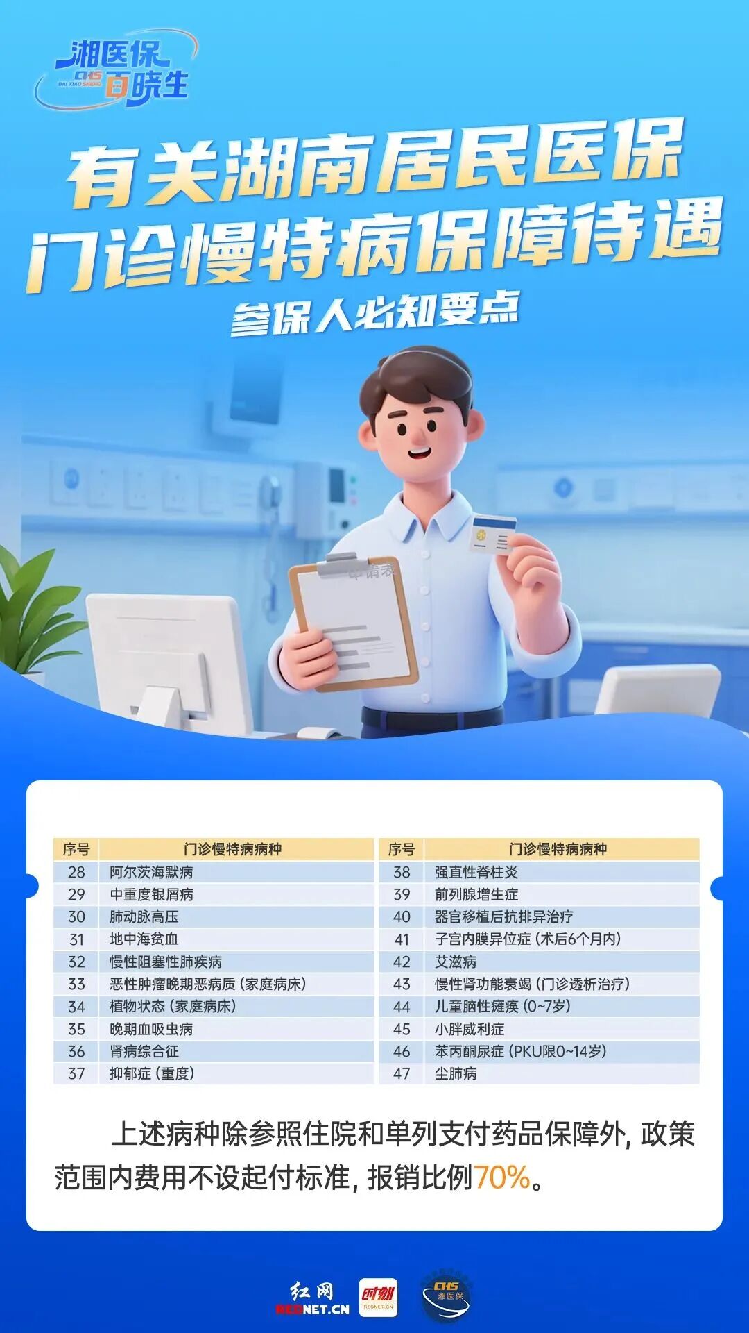 医保政策暖民心,保障细节要厘清。湖南居民医保门诊慢特病保障范围再明确,现已涵盖47个病种,恶性肿瘤、糖尿病、冠心病、肺结核、慢性肾功能衰竭、儿童脑性瘫痪等常见及特殊病种均在列。