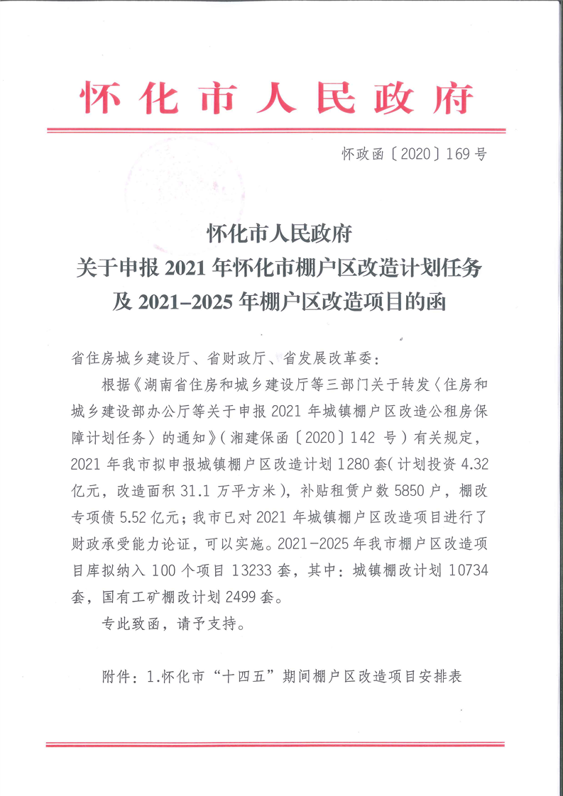 关于申报2021年怀化市棚户区改造计划任务及2021-2025年棚户区改造项目的函