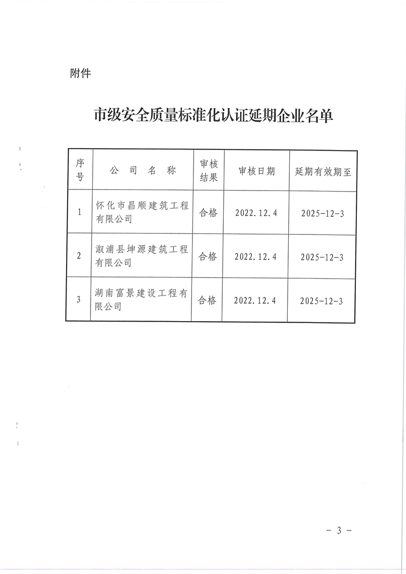 关于同意怀化市昌顺建筑工程有限公司市级安全质量标准化认证延期的通知