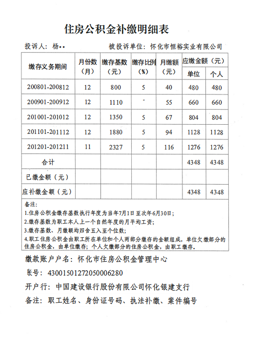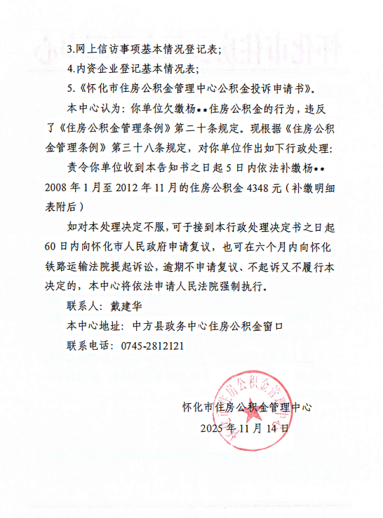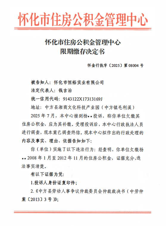 关于对怀化市恒裕实业有限公司限期缴存决定书的公示