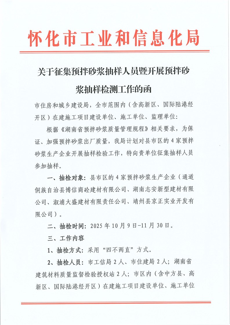 关于征集预拌砂浆抽样人员暨开展预拌砂浆抽样检测工作的函