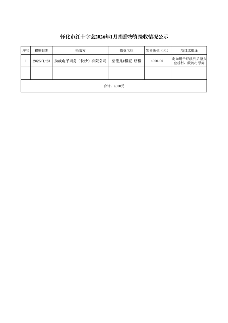 怀化市红十字会2026年1月捐赠物资接收情况公示