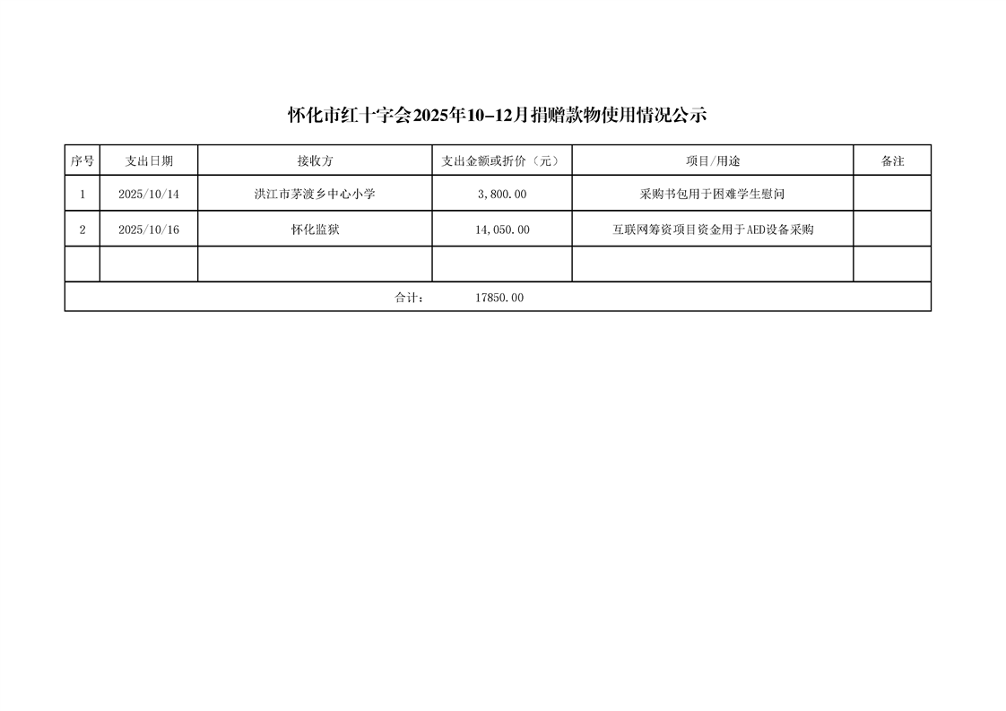 怀化市红十字会2025年10-12月捐赠款物使用情况公示