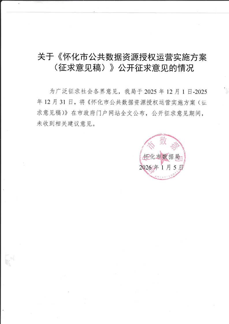 关于《怀化市公共数据资源授权运营实施方案(征求意见稿)》公开征求意见的情况
