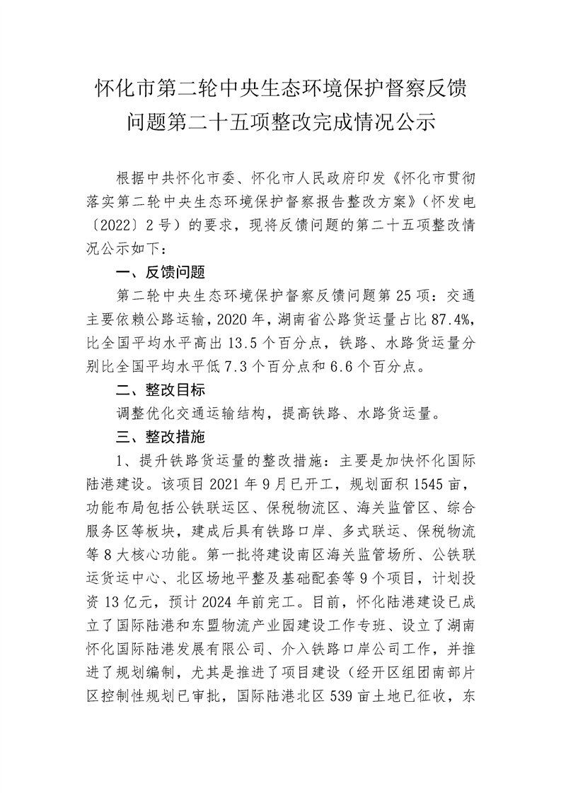 怀化市第二轮中央生态环境保护督察反馈问题第二十五项整改完成情况公示