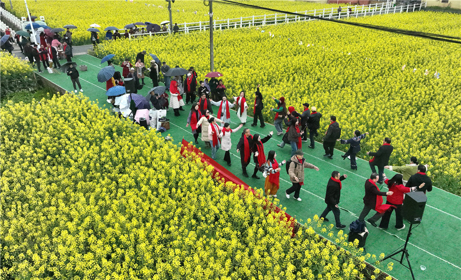 如画的美景不仅留住了本地人的心,也吸引了周边地区的游客慕名而来。来自湘西泸溪县老年大学健身班的学员们身着艳丽服饰,在花海中翩翩起舞。学员龚来桂兴奋地说:“这里的油菜花太漂亮了,我们在这里唱歌跳舞,特别高兴!”