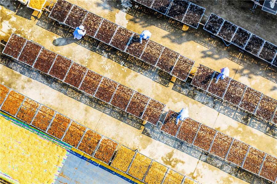 12月10日,通道菁芜洲镇中药材集散中心,农民正在晾晒黄精。近年来,该县依托当地生态优势,大力发展中药材种植与加工产业,逐步形成集种植、收购、加工、销售于一体的产业链条。(石猛雷 摄)