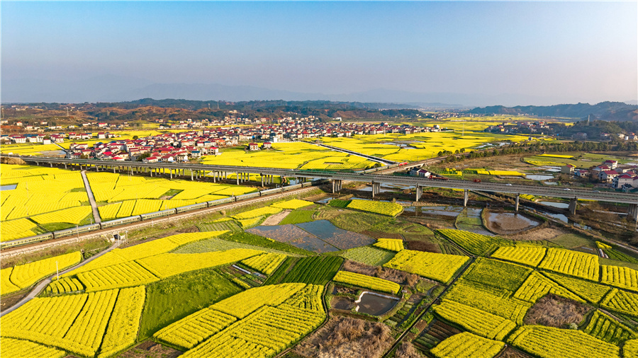 3月14日,溆浦县 30 多万亩油菜花竞相绽放,普速铁路、沪昆高速穿境而过,列车飞驰、车流穿梭,与金黄花海相映成画,勾勒出一幅生态美、产业兴、百姓富的春日盛景,成为溆浦大地最动人的春天名片。