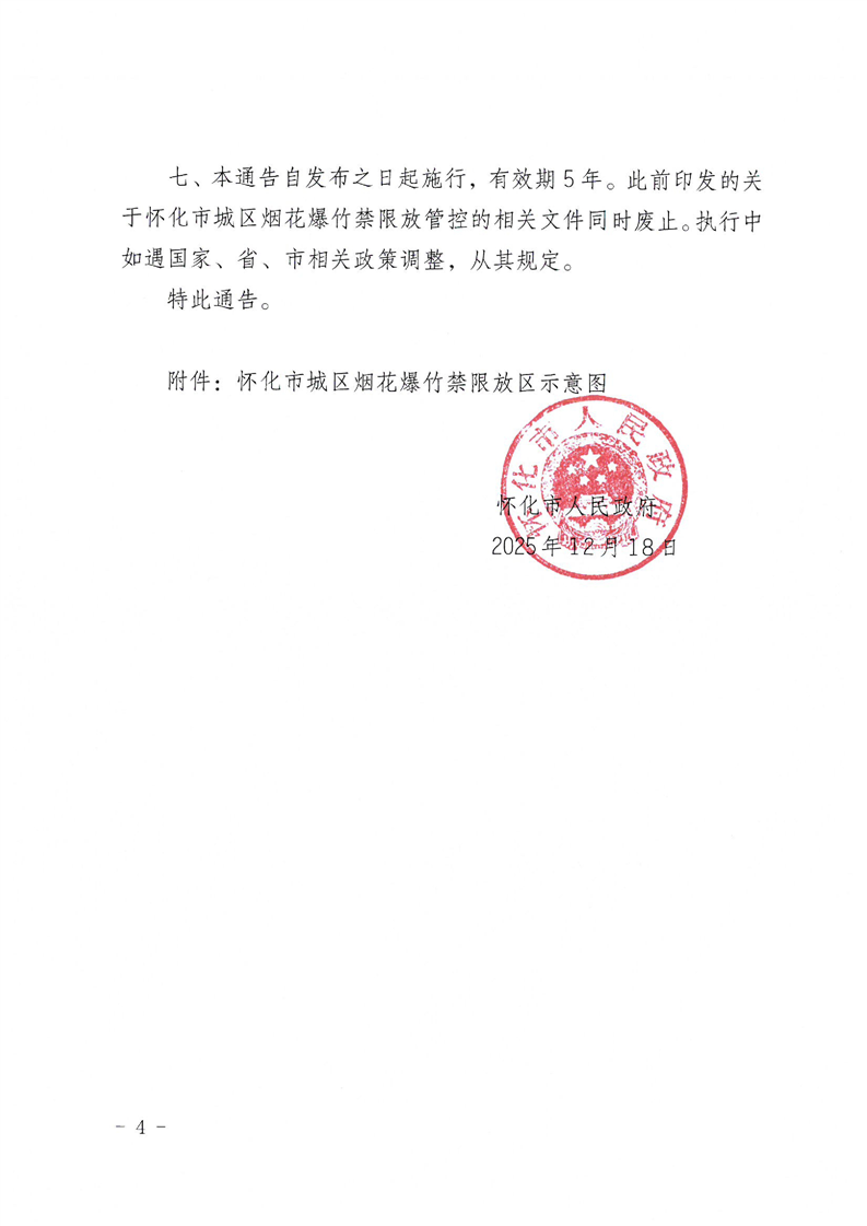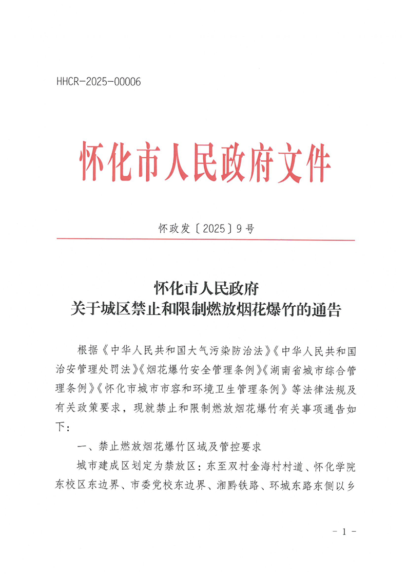 怀化市人民政府关于城区禁止和限制燃放烟花爆竹的通告