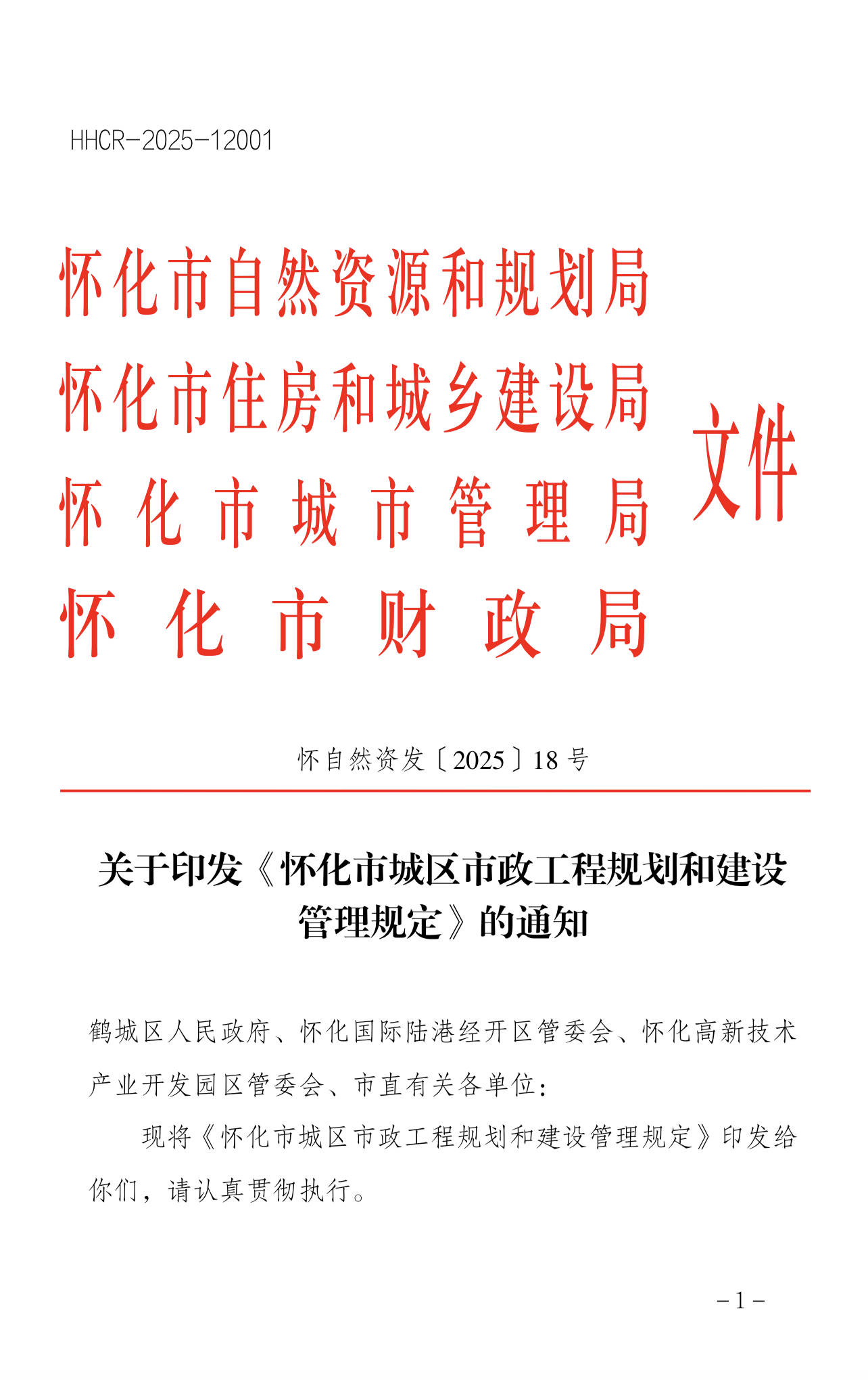 关于印发《怀化市城区市政工程规划和建设管理规定》的通知