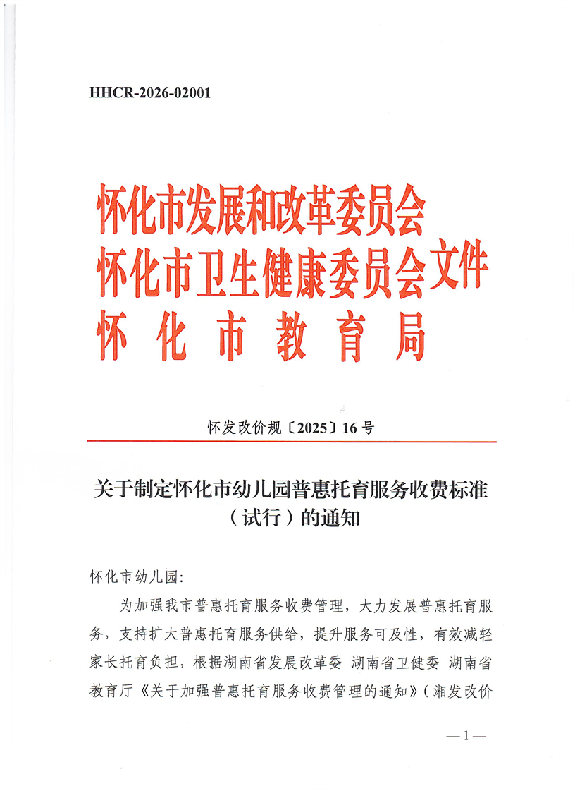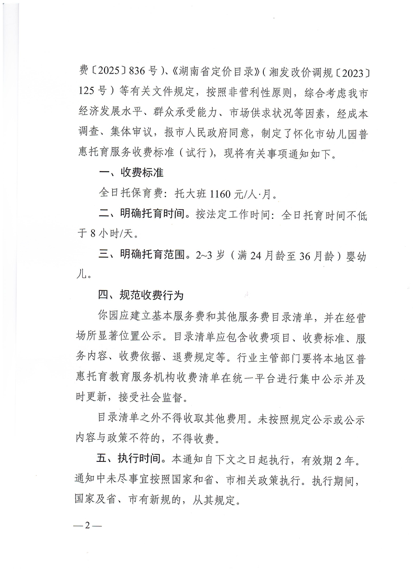 关于制定怀化市幼儿园普惠托育服务收费标准(试行)的通知