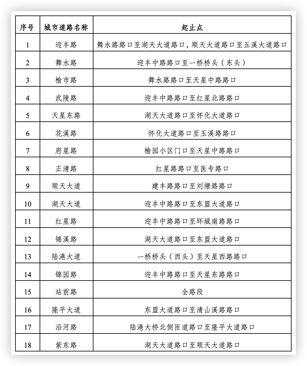 根据怀化城区机动车违法停车管理工作实际情况,现将天星西路、铁北南路机动车违法停车行为严格管理路段调整为非严格管理路段,增设隆平大道、沿河路、紫东路为机动车违法停车行为严格管理路段,迎丰路、顺天大道部分路段做优化调整。城区调整后的严格管理路段如下: