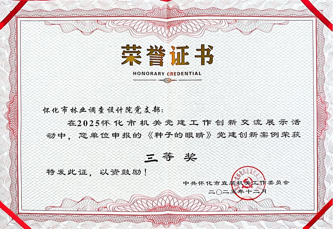 12月17日,在怀化市市直机关工委主办的2025年怀化市机关党建工作创新交流展示活动中,怀化市林业调查设计院党支部凭借鲜明的主题特色与扎实的实践成效,荣获三等奖,以党建创新实践生动诠释了党的二十大及二十届历次全会精神在林业系统的落地生根。