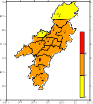 台站旬平均气温27.1-28.8℃,普遍偏高0.1-1.6℃;台站旬降水量11.6-217.6mm,芷江、沅陵、辰溪偏多,其他县市偏少;日照时数27.7-40.1小时,普遍偏少30-56.4%;据调查,目前浅层土壤湿度大部较适宜。