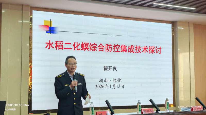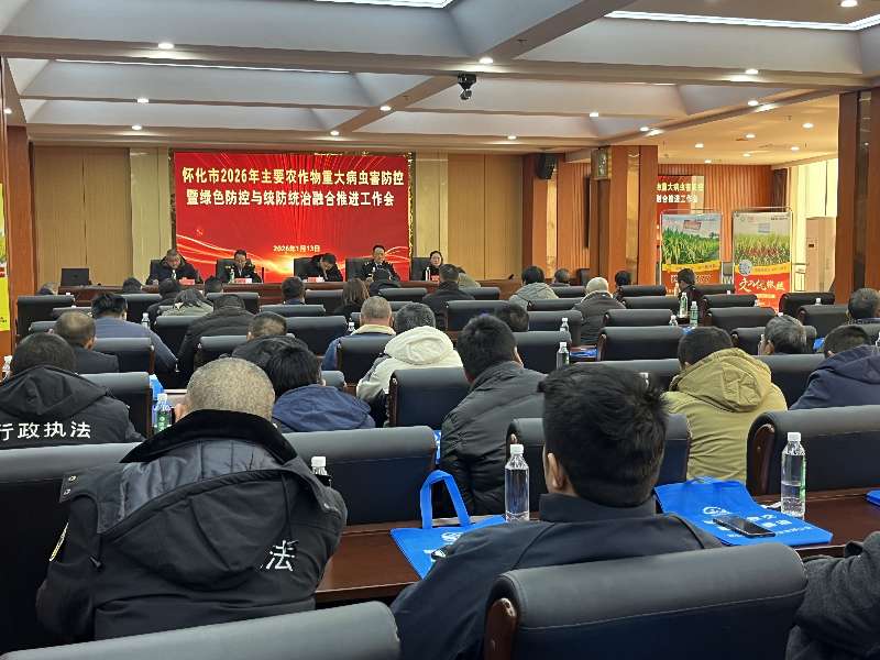 1月13日,怀化市2026年主要农作物重大病虫害防控暨绿色防控与统防统治融合推进工作会召开。针对今冬明春农业生产需求,会议安排部署了柑橘黄龙病疫情防控、冬季蔬菜安全生产、油菜菌核病防控、绿色防控与统防统治融合推进等重点植保植检工作,为全年农业丰产筑牢防线。全市13个县(市、区)植保植检相关负责人、21家专防组织负责人及80名种粮大户齐聚一堂,共学农作物病虫害防控良策。