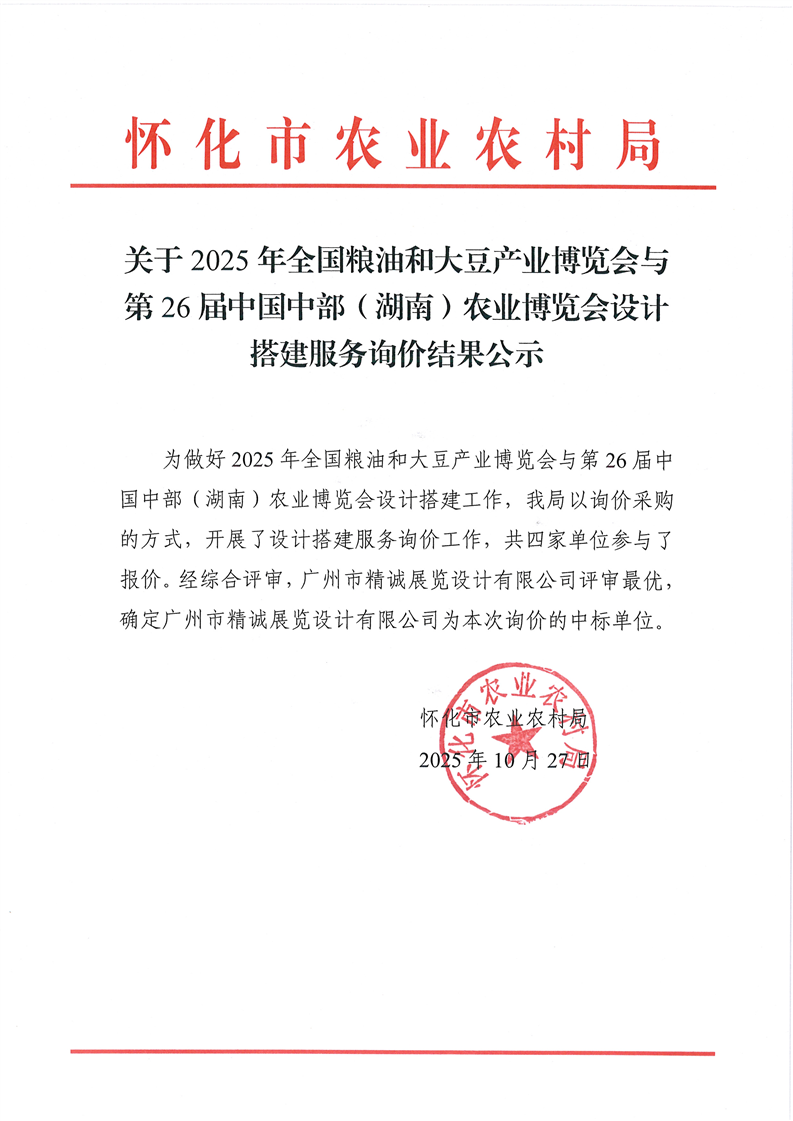 关于2025年全国粮油和大豆产业博览会与第26届中国中部(湖南)农业博览会设计搭建服务询价结果公示