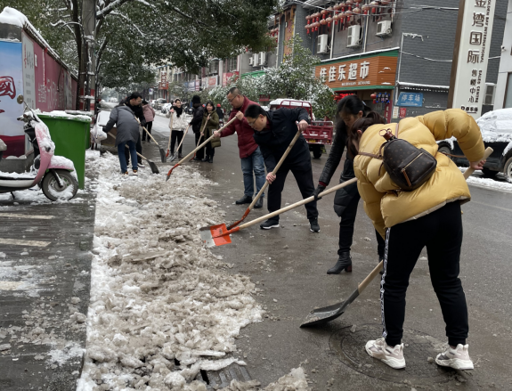 大家不惧严寒,挥动手中的铁锹、笤帚,干得热火朝天。平时斯斯文文的女同志,干起活来也毫不含糊,铲不动的冰块就几个人合作一起使劲儿。在大家的齐心协力、共同奋战下,该路段人行道上的积雪被全部清扫干净。大家还配合市政工人对路两旁被积雪压断的树枝树叶进行了清理。