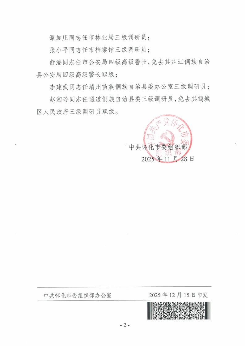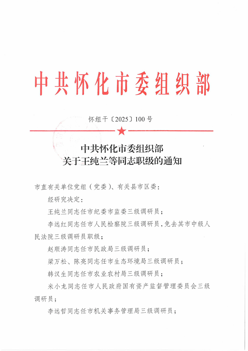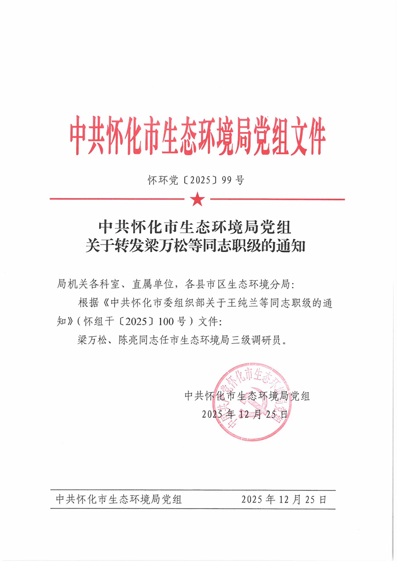中共怀化市生态环境局党组关于转发梁万松等同志职级的通知(怀环党〔2025〕99号)