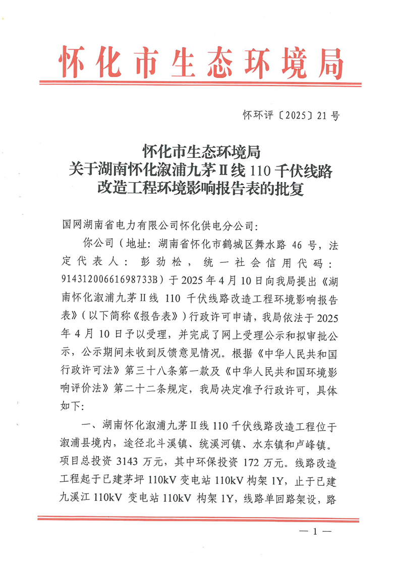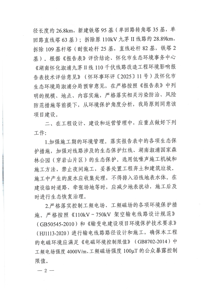 关于湖南怀化溆浦九茅Ⅱ线110千伏线路改造工程环境影响报告表的批复