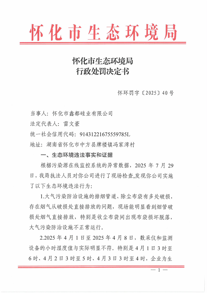 怀化市鑫都硅业有限公司(怀环罚字〔2025〕40号)
