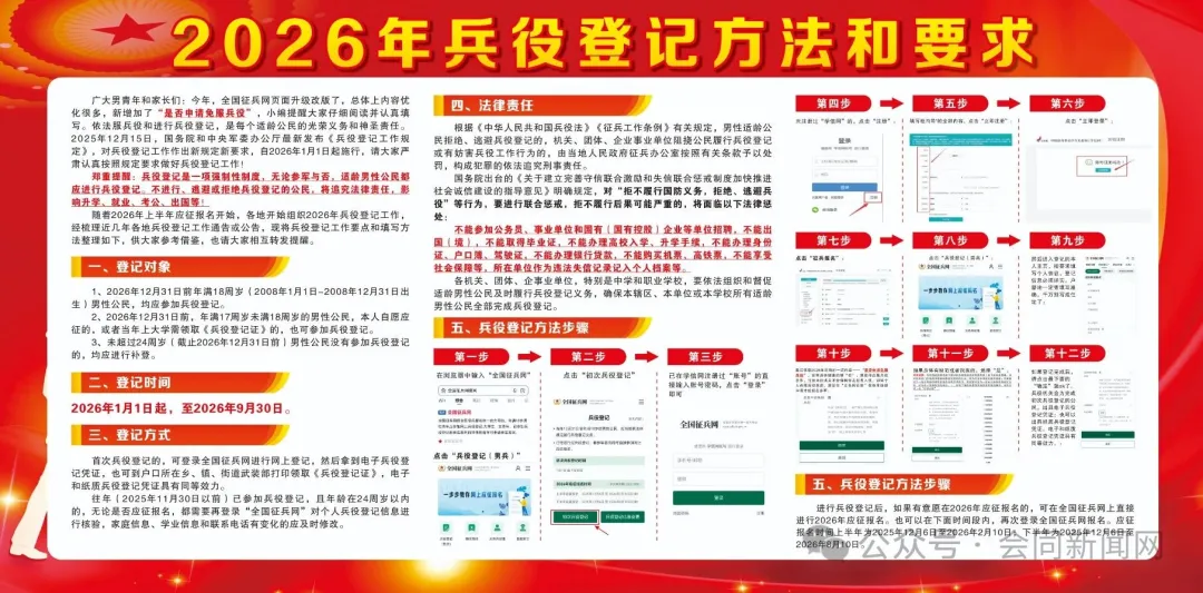 与此同时,工作人员还向适龄学生发放精心编制的兵役登记宣传手册。手册不仅涵盖详细的政策解读,还清晰附上全国征兵网登录入口、操作流程图解及咨询联系方式,方便学生随时查阅、便捷咨询。校园醒目位置整齐摆放的宣传展板,以图文并茂的形式,从法定依据、对象范围、时间节点、操作步骤、注意事项等方面,清晰解答“谁需要登记”“怎么登记”“登记后有什么义务”等关键问题,为学生提供一目了然的指引。