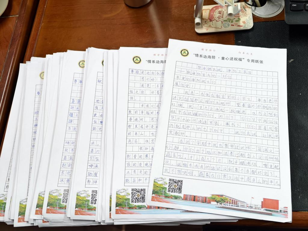 上午9时许,大屏幕上循环播放着边海防官兵坚守岗位的纪实画面,安静的教室里笔尖划过方格纸发出沙沙声响。孩子们低头伏案,认真斟酌着。五年级学生李佳营在信中写道:“敬爱的边海防叔叔,你们在海边站岗的时候,会不会想家?我画了一艘军舰送给你们。”她的贺卡上,一艘涂着蓝白颜料的军舰正航行在波浪里,旁边还有一面小小的五星红旗。