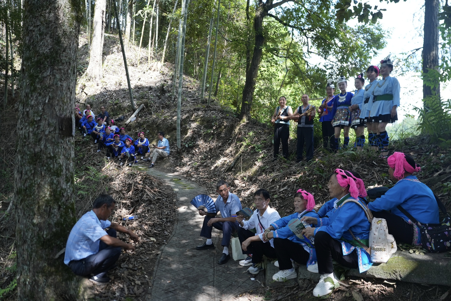 歌场内外,对歌、侃堂子活动同样火热。岩湾村后龙山的山头、歌场楼下,村民们自发围坐成圈,你唱我和、以歌传情。
