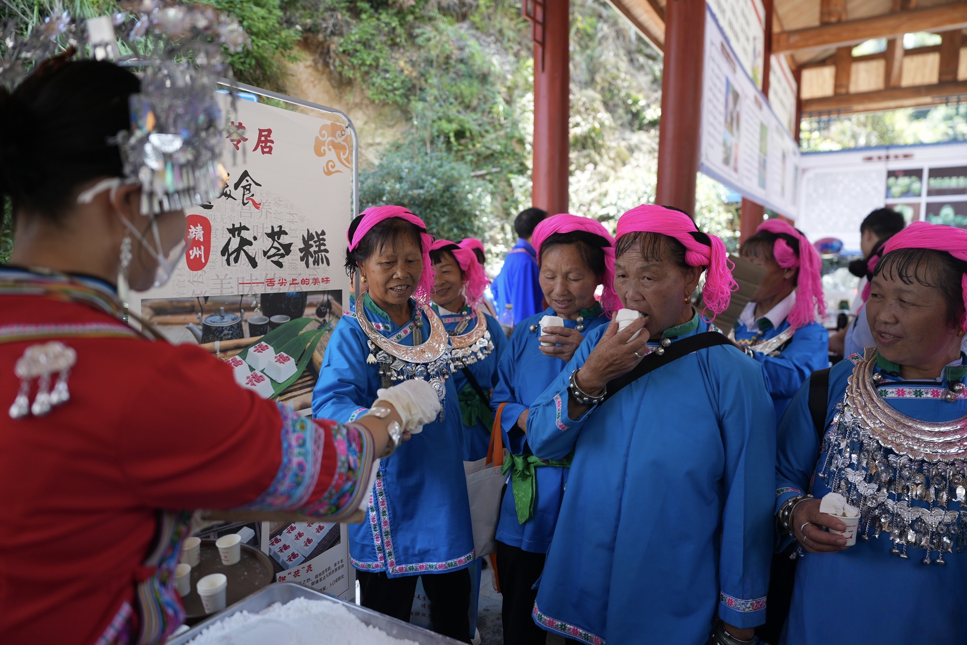 岩湾民族文化长廊内,两省三县的非物质文化遗产展示格外吸睛。造型精巧的雕花蜜饯、口感软糯的茯苓糕、独具匠心的竹编作品、香气四溢的黄精茶……各类非遗展品琳琅满目,让人目不暇接。