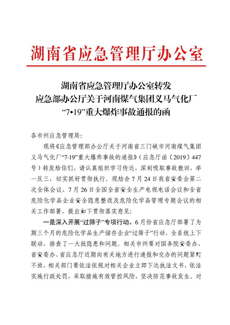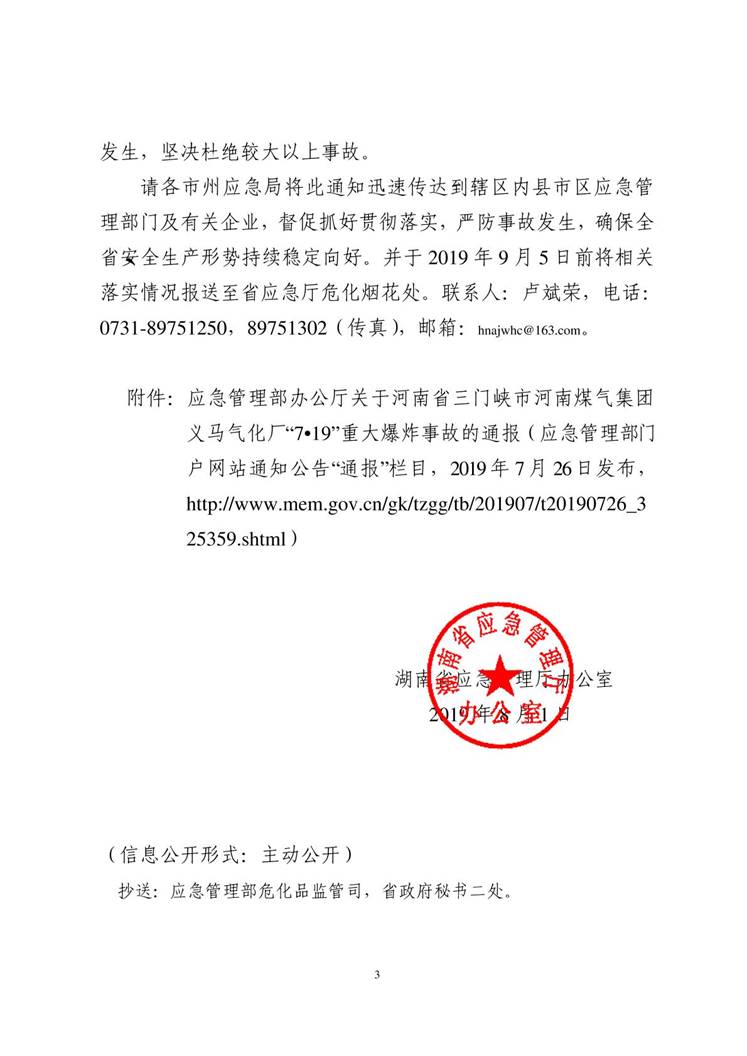 现将《湖南省应急管理厅办公室转发应急部办公厅关于河南煤气集团义马气化厂“7·19”重大爆炸事故通报的函》转发给你们,请按照要求认真组织学习传达,深刻吸取事故教训,举一反三,切实抓好贯彻执行,做好危险化学品安全管理工作。请于2019年8月26日前将相关落实情况报送至市应急管理局危化烟花科。联系人:张海涯,电话:0745-2235563,邮箱:whk2235563@163.com。