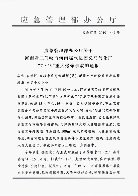 湖南省应急管理厅办公室转发应急部办公厅关于河南煤气集团义马气化厂“7·19”