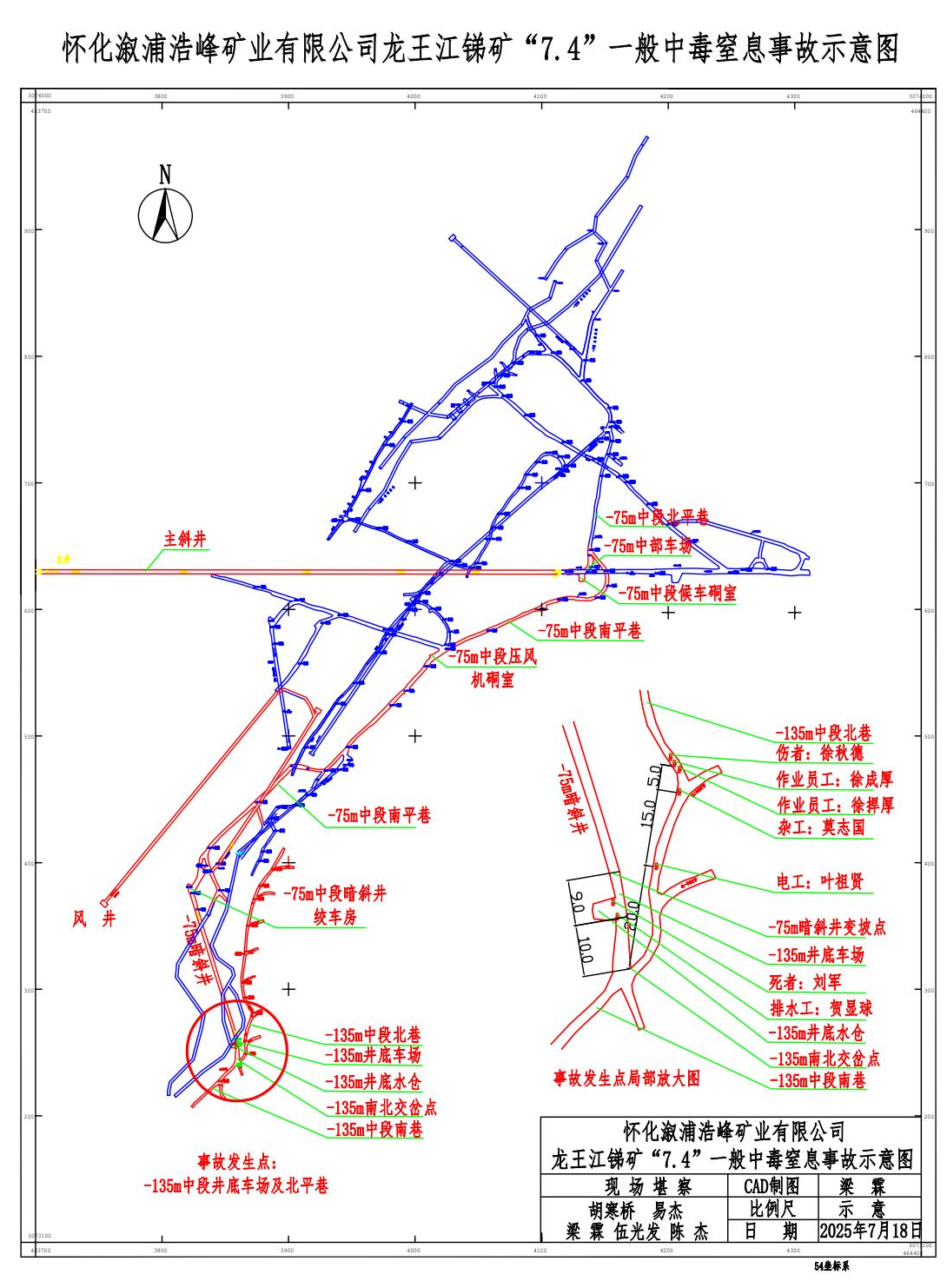 2025年7月4日9时06分,怀化市溆浦县浩峰矿业有限公司龙王江锑矿-135m车场及北平巷发生一起一般中毒窒息事故,造成1人死亡、1人轻伤,直接经济损失147.4万元。