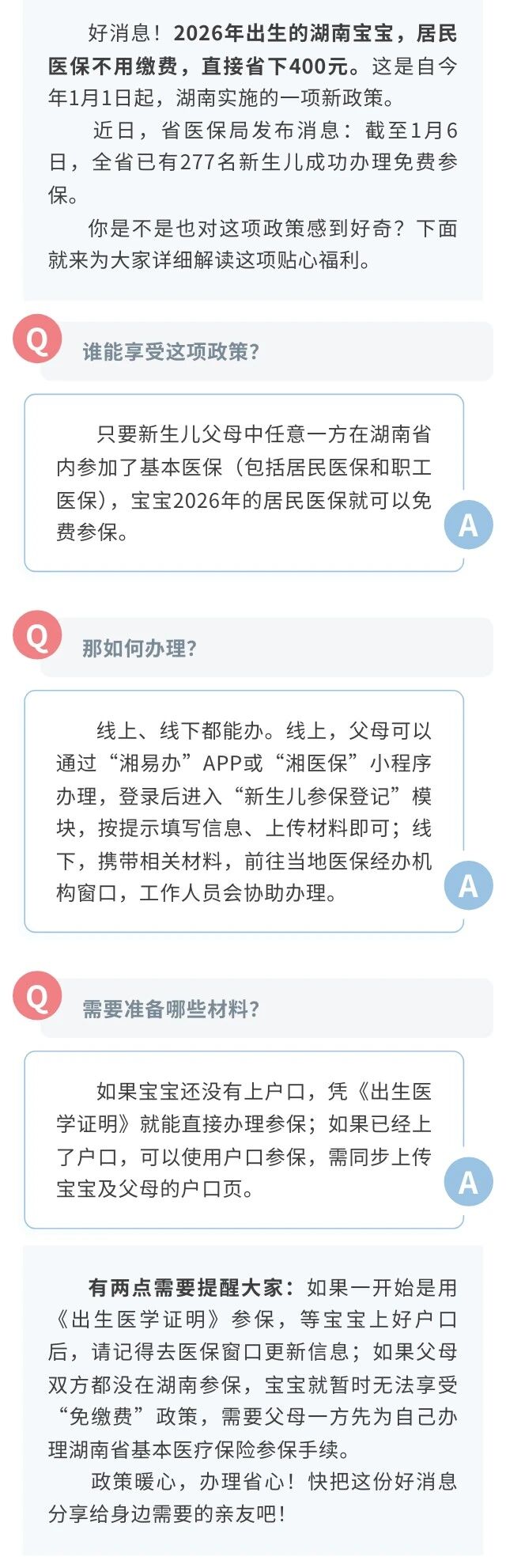 今年出生的湖南宝宝,居民医保免费办!