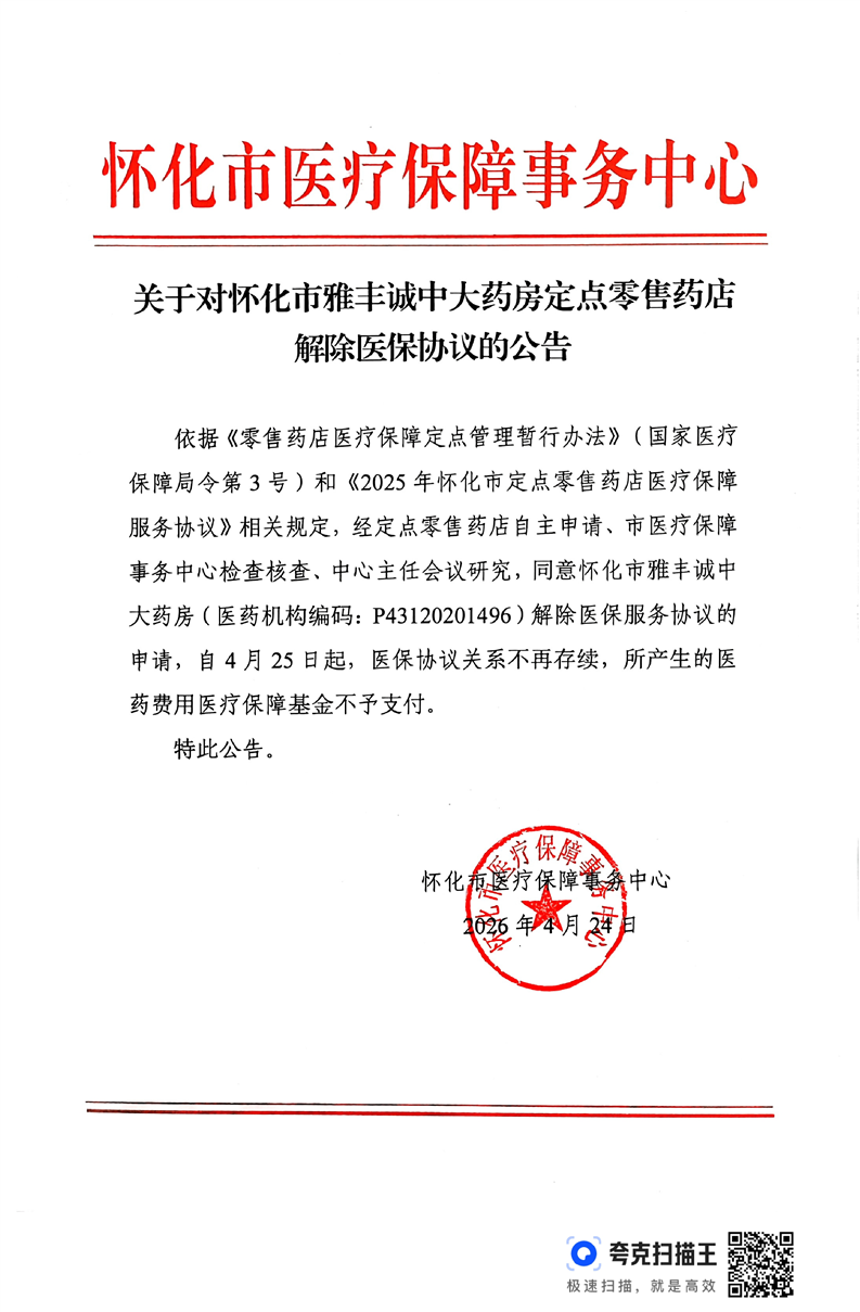 怀化市医疗保障事务中心关于对怀化市雅丰诚中大药房定点零售药店解除医保协议的公告