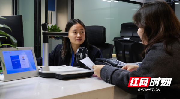 11月5日清晨,沅陵县政务服务大厅内人潮涌动,医疗保障局工作人员宋茜雯正在医保综合服务窗口内为群众服务。