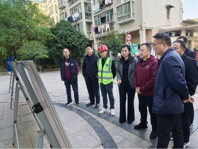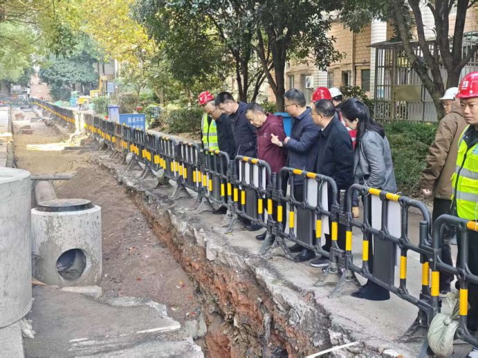 (调研组在翻身塘水库-老烟草公司片区排水设施改造工程现场听取项目进展情况介绍)